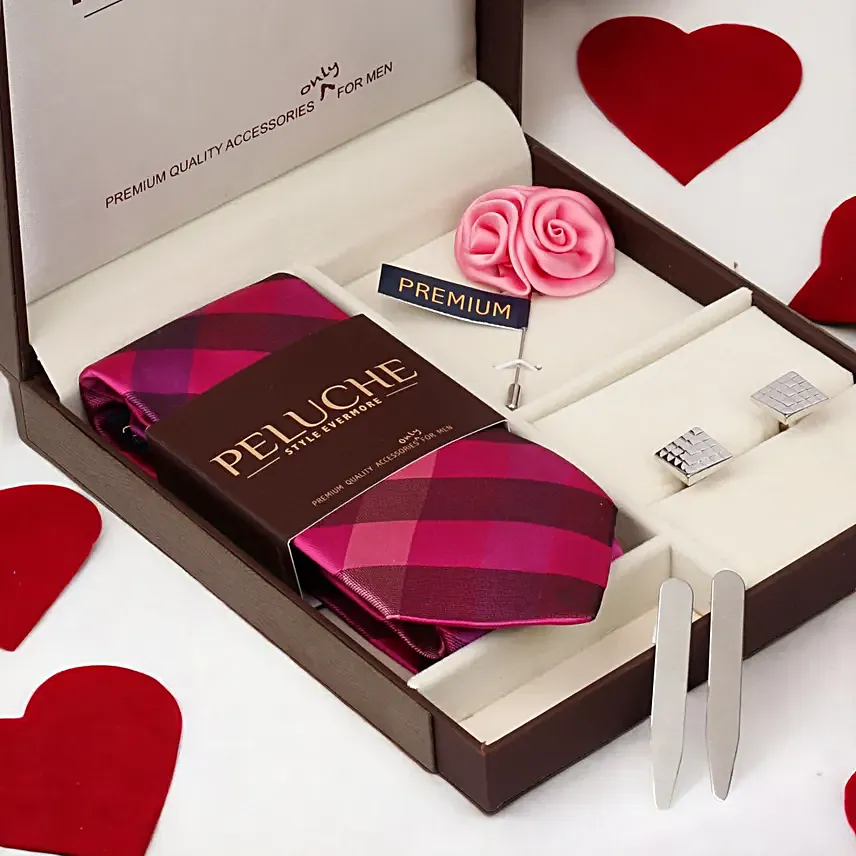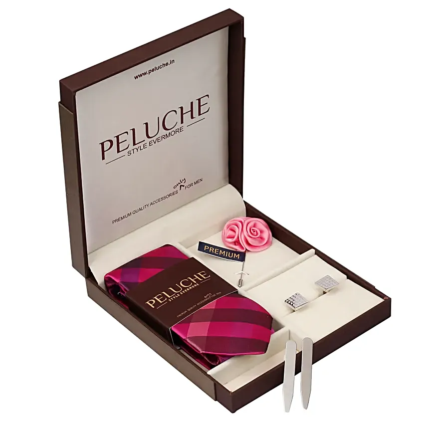 Peluche Checkered Tie & Cuflink Gift- Pink