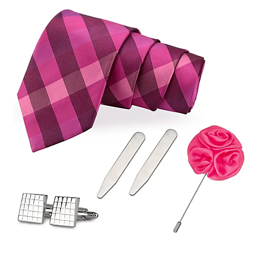 Gift this set to a man who appreciates refined style and watch him stand out with effortless sophistication It boasts a captivating pink checkered necktie a sophisticated cufflink set a stylish brooch and a practical collar stay set The classic checkered print makes this ensemble an ideal accessory for both formal events and everyday wear The combination of style and elegance is bound to enhance his overall look ensuring he stands out with finesse
