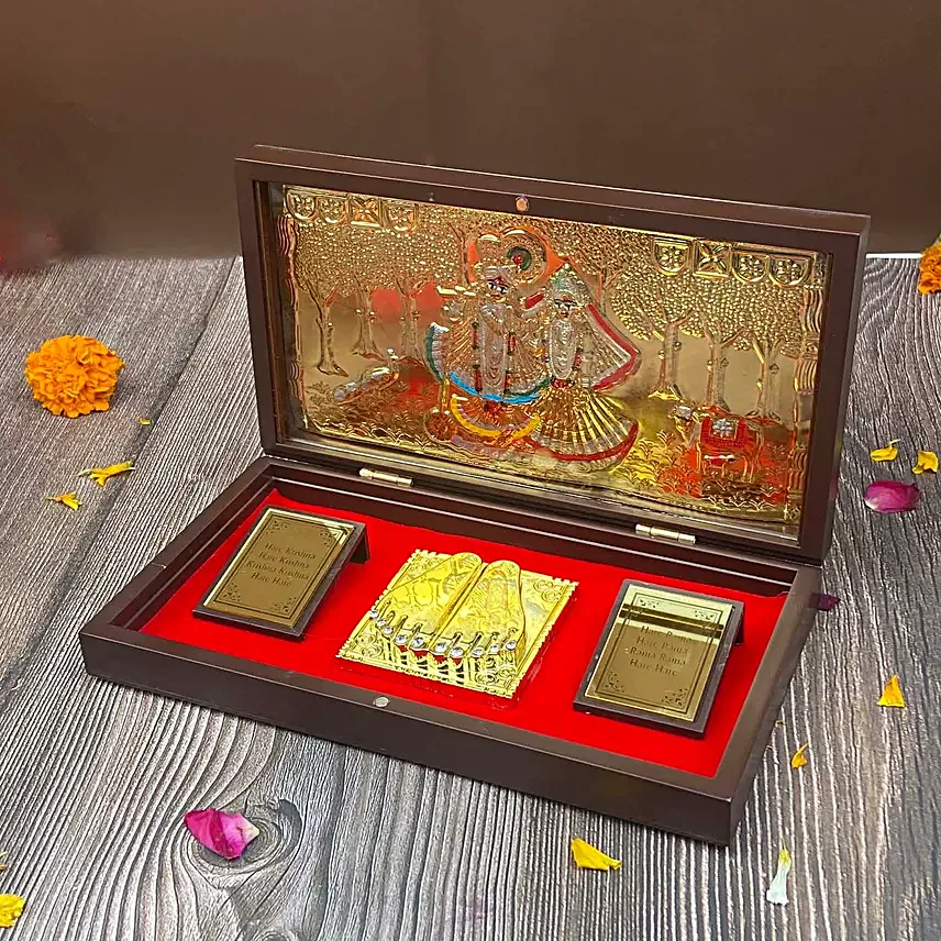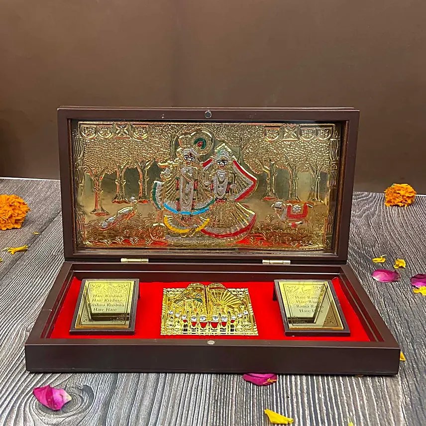 Embrace the divine presence of Radha and Krishna with this exquisite pooja box, a perfect gift to bestow love, peace and happiness upon someone dear. Crafted with meticulous attention to detail, it radiates beauty and serves as a cherished symbol of divine blessings.